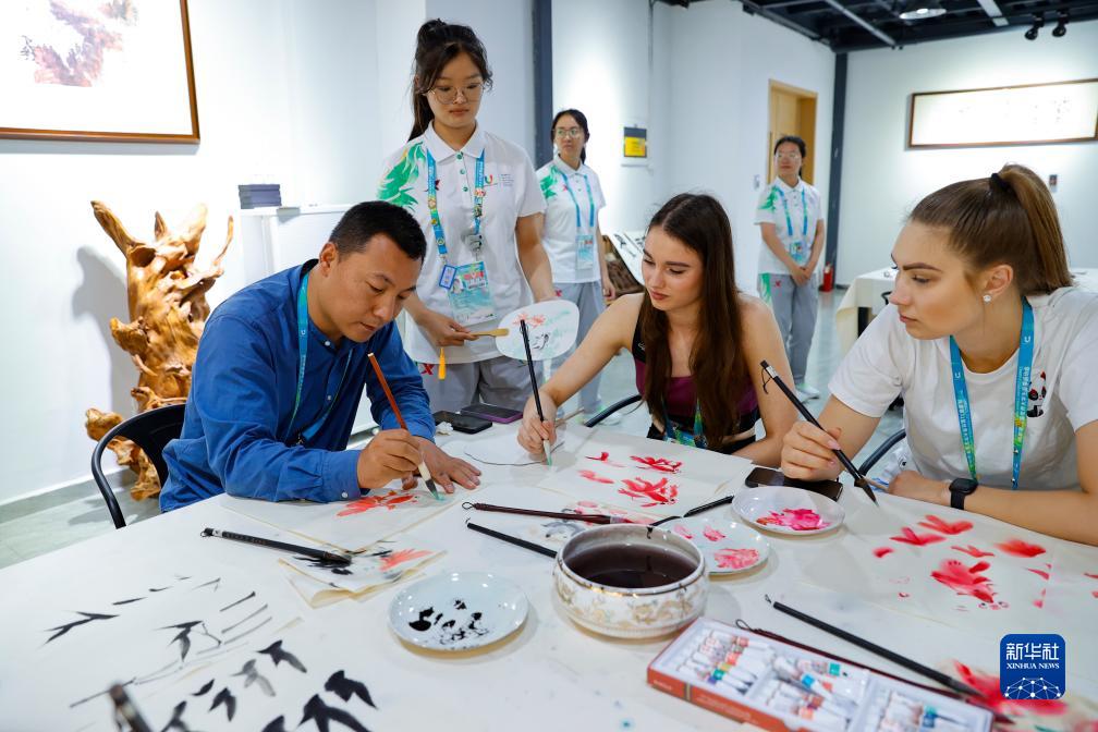 7月31日,在成都大運村,四川師范大學(xué)美術(shù)學(xué)院副教授焦海龍(前左)在為愛(ài)沙尼亞運動(dòng)員阿德利娜(前中)和漢娜(前右)示范中國畫(huà)的繪畫(huà)技法。