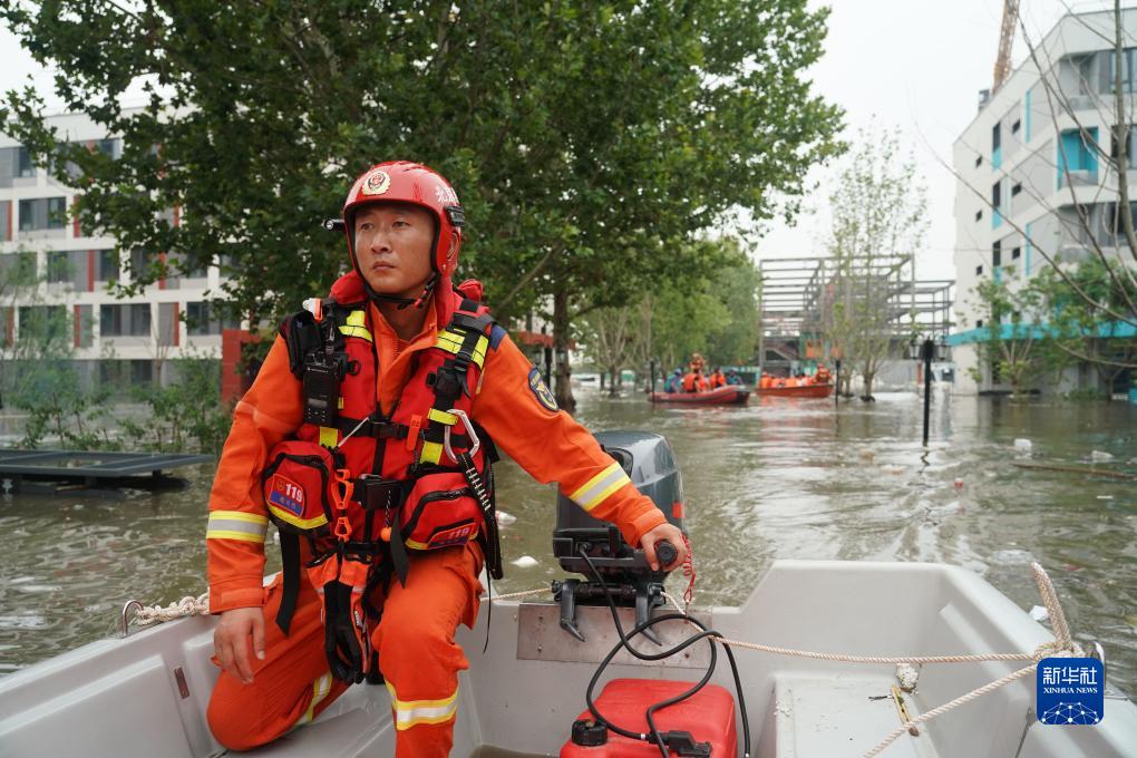 8月2日,在北京市房山區琉璃河鎮平各莊村,消防員駕駛沖鋒舟前往救援受災群眾。