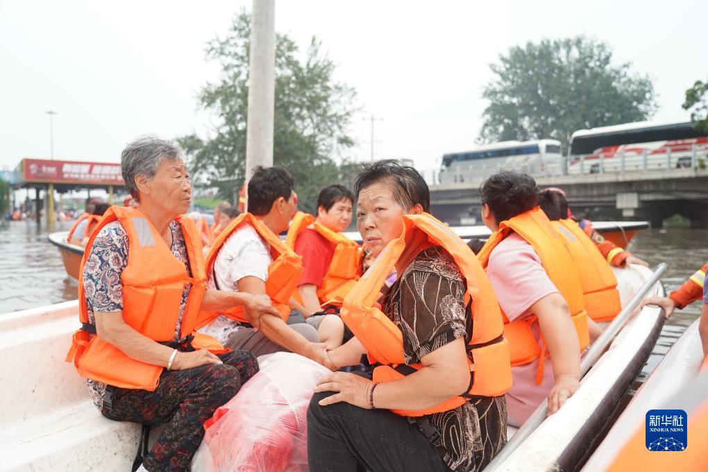 8月2日,在北京市房山區的京港澳高速琉璃河出口附近,受災群眾乘坐沖鋒舟前往轉運車(chē)輛乘車(chē)點(diǎn)。