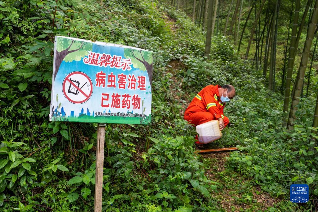 8月2日,在桃江縣桃花江國有林場(chǎng),護林員在誘殺裝置中施放治理竹蝗的藥水。