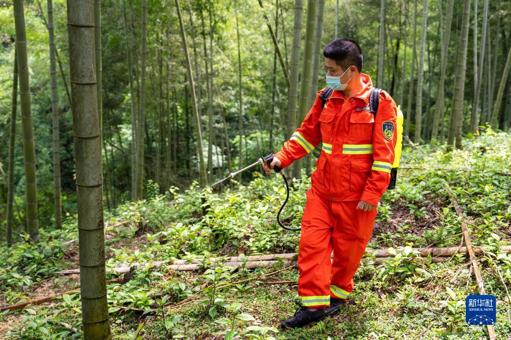 8月2日,在桃江縣桃花江國有林場(chǎng),護林員噴灑治理竹蝗的藥水。