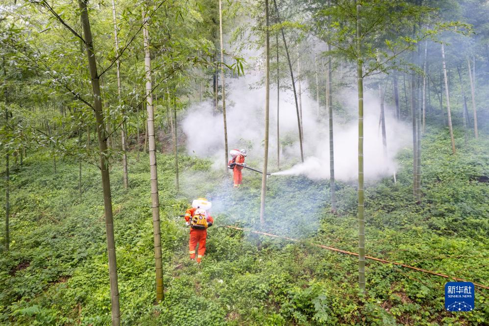 8月2日,在桃江縣桃花江國有林場(chǎng),護林員噴灑治理竹蝗的藥粉(無(wú)人機照片)。