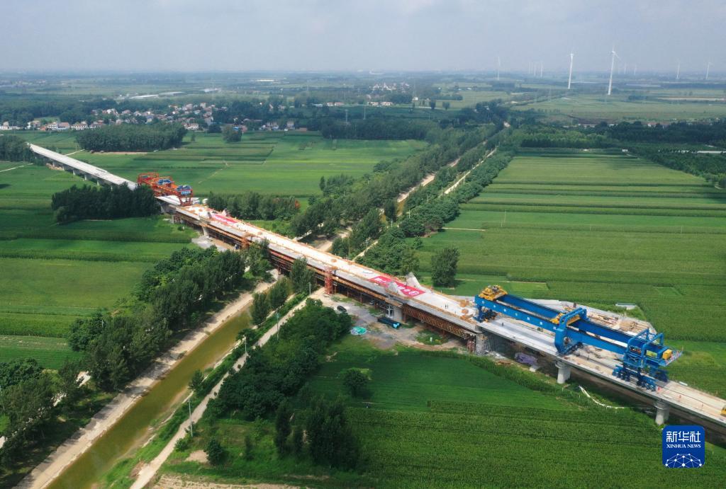 8月2日,架橋機在菏蘭高鐵蘭考特大橋上進(jìn)行箱梁架設作業(yè)(無(wú)人機照片)。