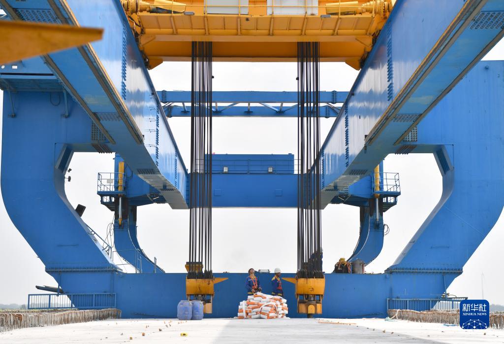 8月2日,架橋機在菏蘭高鐵蘭考特大橋上進(jìn)行箱梁架設作業(yè)。