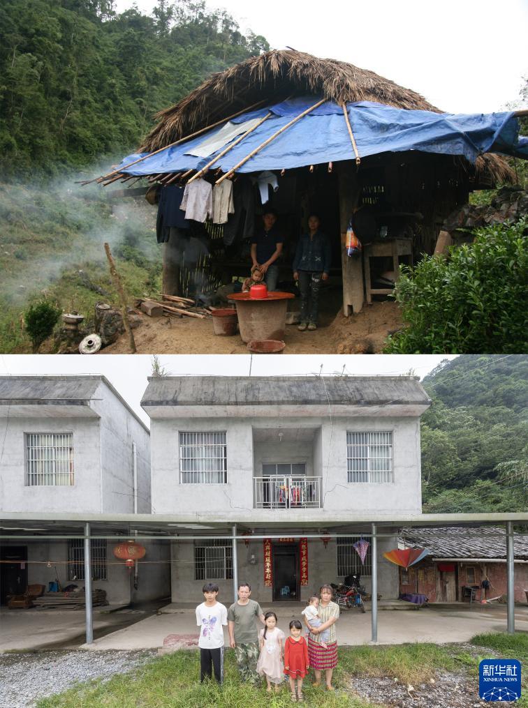 這是一張拼版照片:上圖為2008年11月14日,陶文學(xué)(前左)和父母一起站在茅草屋前合影(新華社記者張愛(ài)林攝);下圖為2023年7月30日,陶文學(xué)(左一)和父親陶建明(左二)以及繼母和三個(gè)妹妹在新居前合影(新華社記者費茂華攝)。