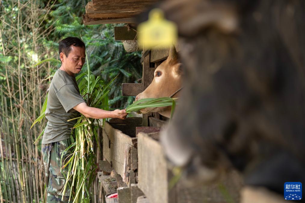 7月30日,陶文學(xué)的父親陶建明在喂牛。新華社記者費茂華攝