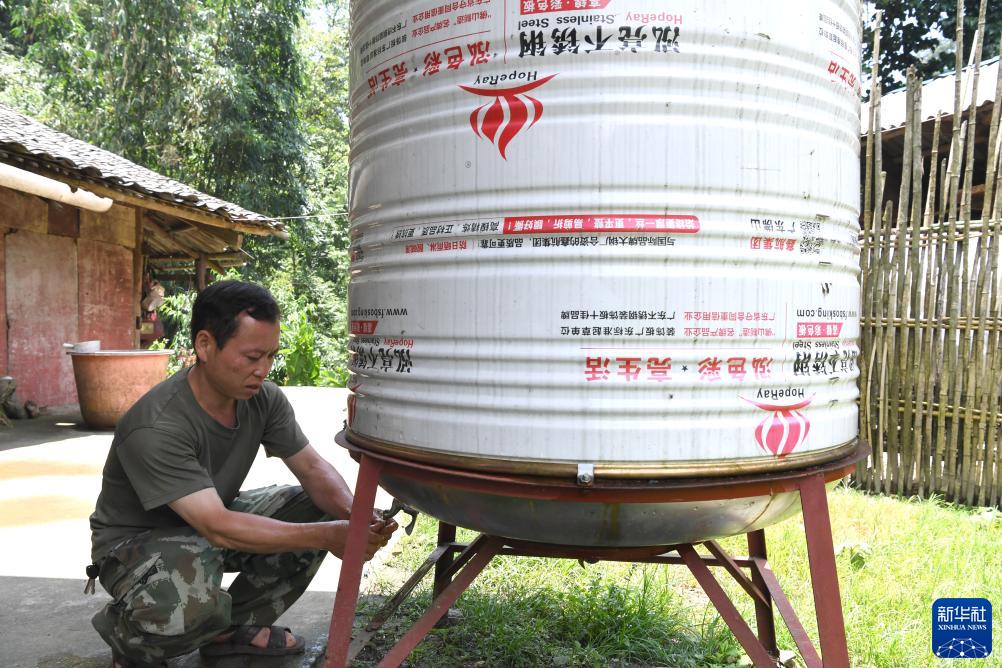 7月30日,陶文學(xué)的父親陶建明在那坡縣百省鄉水弄屯用收集的雨水洗手。新華社記者周華攝