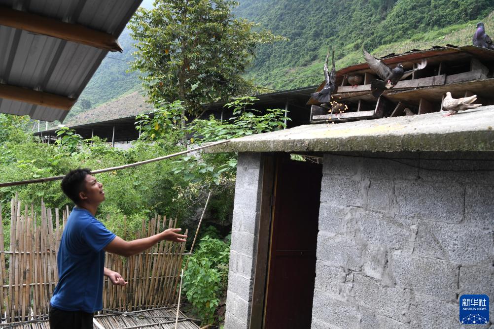 7月31日,吳星海在那坡縣百南鄉甲柳村上保屯喂鴿子。新華社記者周華攝
