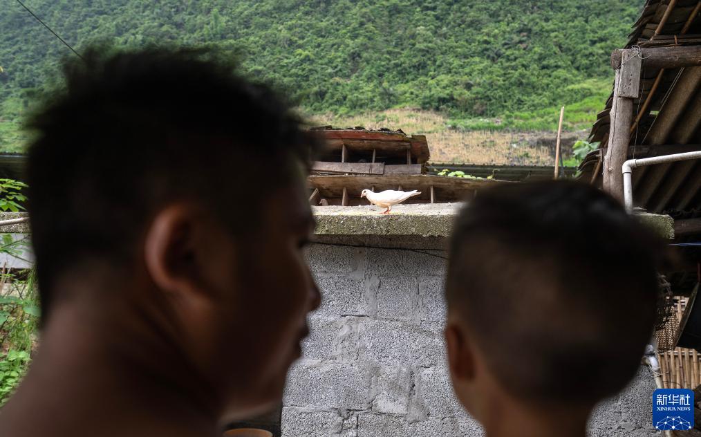 7月31日,吳星海(左)抱著(zhù)兒子觀(guān)察家中飼養的鴿子。新華社記者費茂華攝