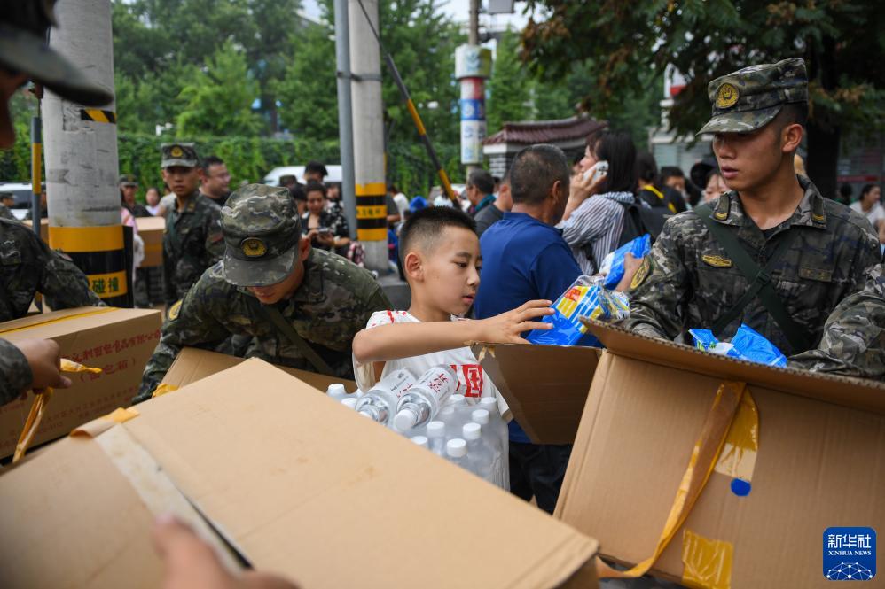 8月2日,在北京市門(mén)頭溝區妙峰山鎮政府附近,武警北京總隊機動(dòng)三支隊官兵為K396次列車(chē)旅客分發(fā)食物和水。