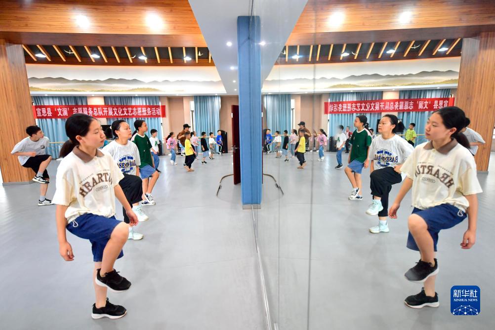 8月2日,孩子們在湖北省宣恩縣文化館練習舞蹈基本功。