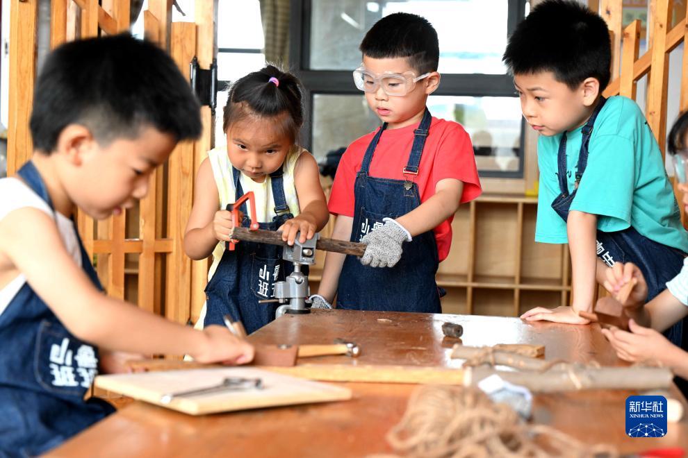 8月2日,小朋友在河北省石家莊市新華區星禾幼兒園體驗木工制作。