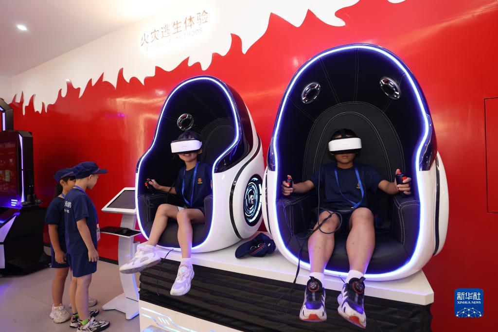 8月2日,在福建省廈門(mén)市消防科技教育館,小學(xué)生通過(guò)消防VR設備體驗火災逃生。