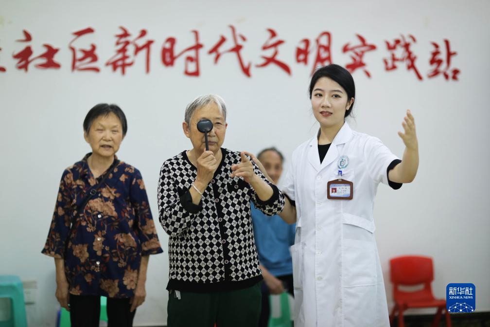 在赤水市市中街道康佳社區,醫務(wù)人員為老人做視力檢測(7月24日攝)。