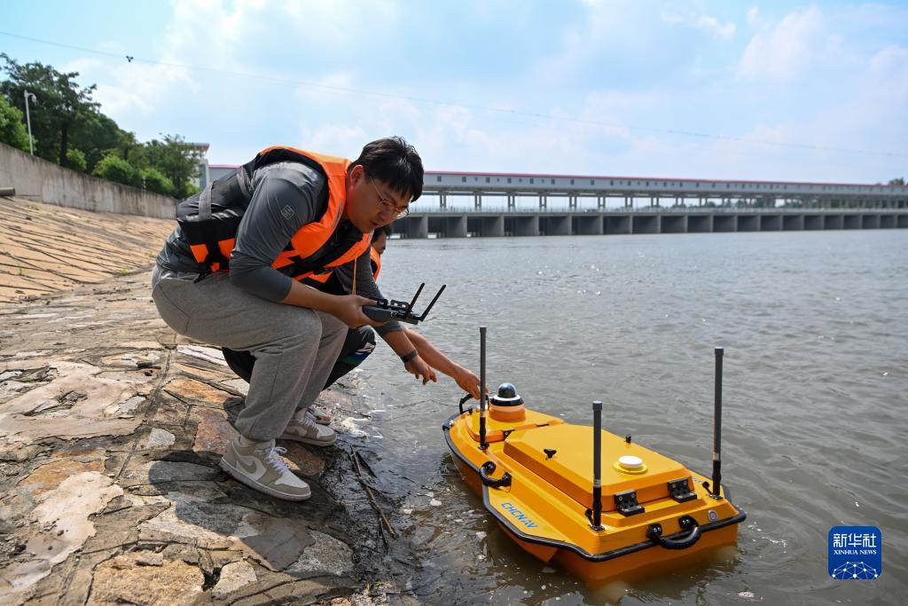 8月2日,在天津市獨流減河進(jìn)洪閘上游,水文人員在岸邊準備使用無(wú)人水文監測船進(jìn)行水文監測。