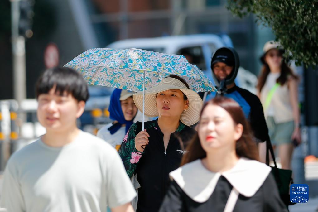 8月3日,市民頂著(zhù)烈日走在韓國釜山街頭。