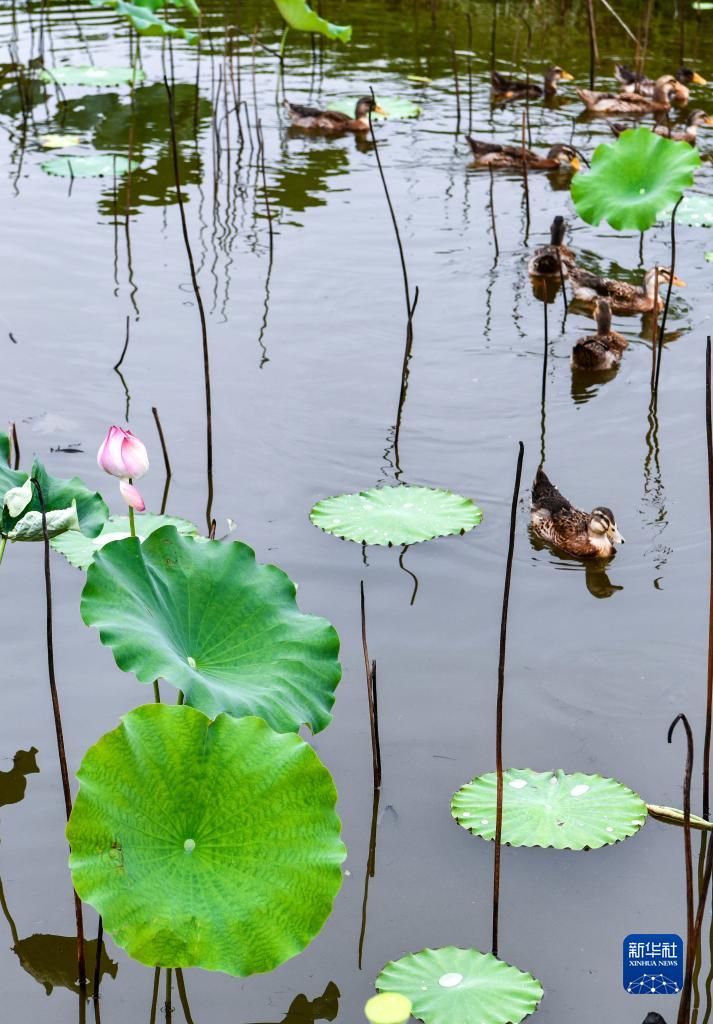 8月2日,鴨子在貴州省岑鞏縣客樓鎮下寨村的荷塘里覓食。