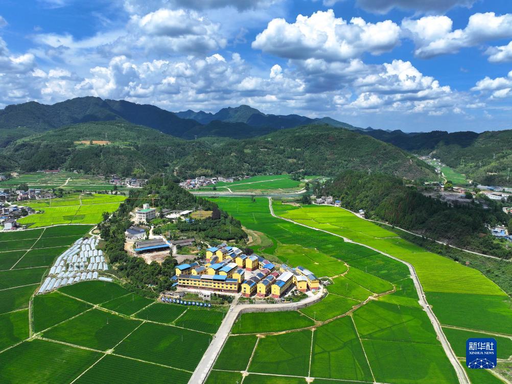 這是8月1日在貴州省岑鞏縣思旸鎮磨寨村拍攝的村莊與稻田(無(wú)人機照片)。