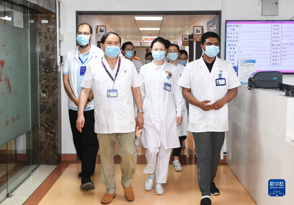 8月1日,在江蘇省人民醫院消化內鏡科,主任醫師范志寧(前左)帶著(zhù)來(lái)自埃及艾因夏姆斯大學(xué)醫院、中埃聯(lián)合培養的博士生穆罕默德·哈斯基亞(后左)等查房。