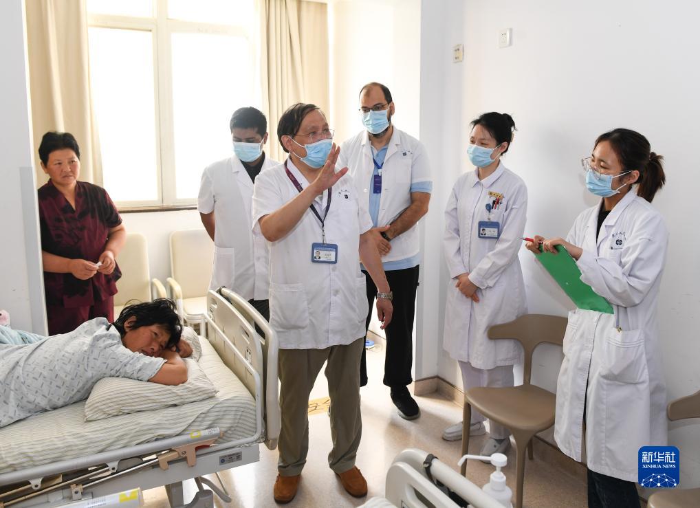 8月1日,在江蘇省人民醫院消化內鏡科病房,主任醫師范志寧(右四)帶著(zhù)來(lái)自埃及艾因夏姆斯大學(xué)醫院、中埃聯(lián)合培養的博士生穆罕默德·哈斯基亞(右三)等查房