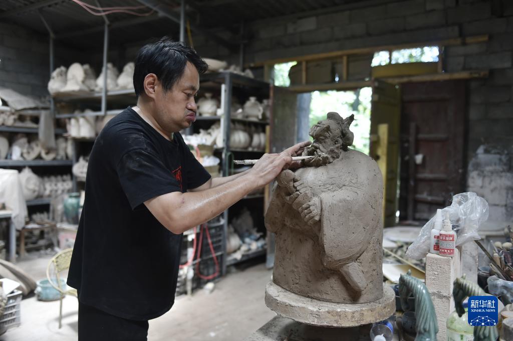 8月3日,在河南省禹州市神垕鎮槐樹(shù)灣村陶瓷創(chuàng )客基地,鈞瓷藝人楊根成在自己的工作室里創(chuàng )作鈞瓷作品。