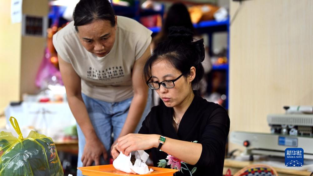 在靖西市非遺傳承人王秀芬繡球制作車(chē)間,王秀芬(右)在稱(chēng)取香料制作香囊(8月2日攝)。