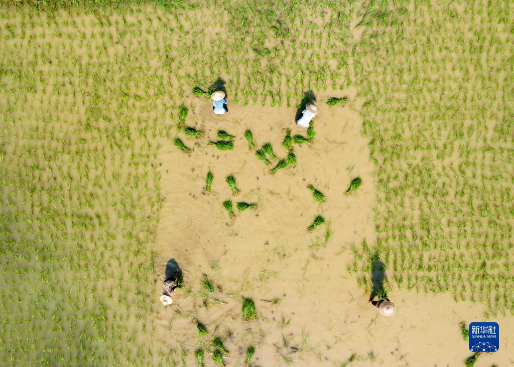 8月4日,在湖南省永州市道縣壽雁鎮芽洞村,農民搶插晚稻(無(wú)人機照片)。