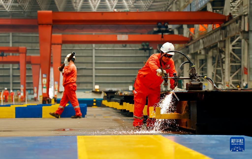 8月4日,工人在建造現場(chǎng)進(jìn)行鋼材切割作業(yè)。