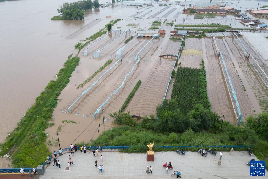 8月4日,人們在黑龍江省牡丹江市鐵嶺河牡丹江公路大橋觀(guān)察水情(無(wú)人機照片)。