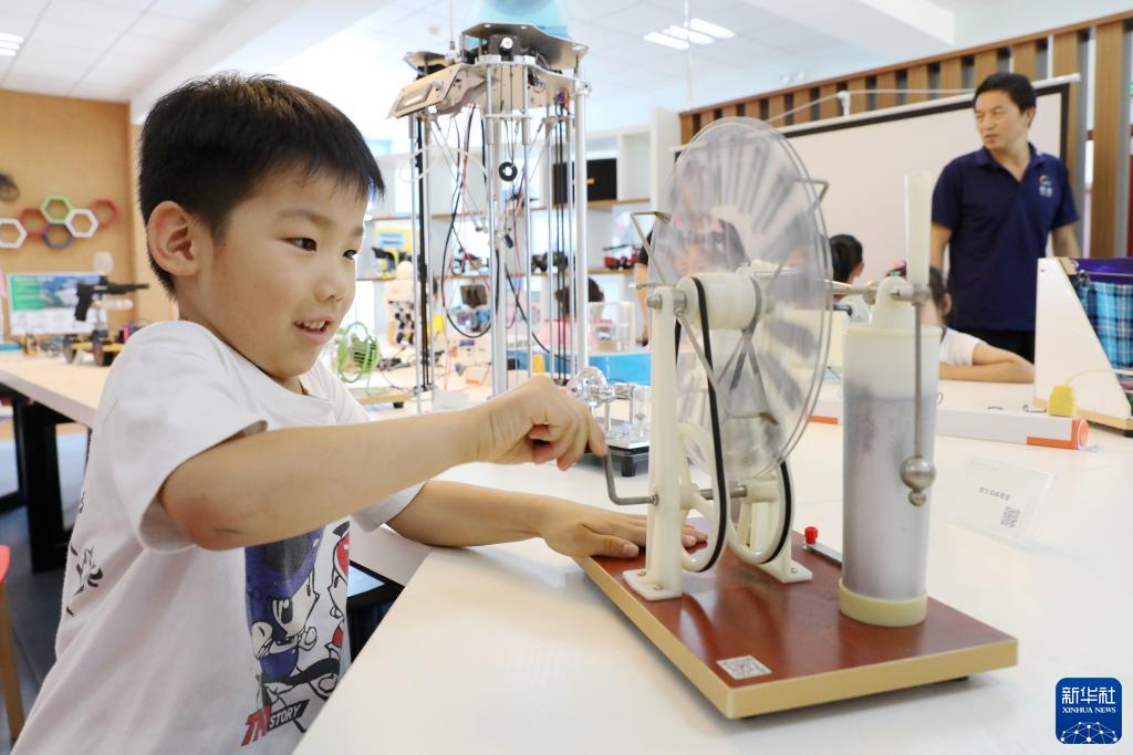 8月4日,在山東省青島西海岸新區黃島街道前灣社區科普館,青少年在體驗靜電感應起電機。