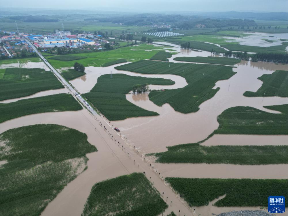 這是8月4日拍攝的吉林省舒蘭市開(kāi)原鎮部分受洪水侵襲的道路和農田(無(wú)人機照片)。