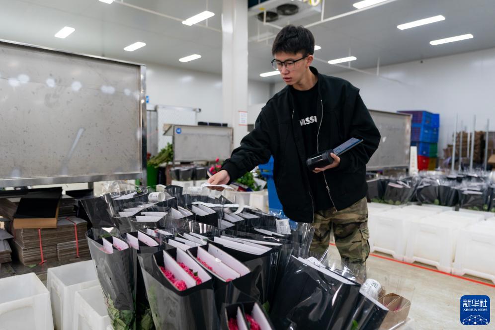 在云天化晉寧花卉產(chǎn)業(yè)現代化示范園內,一名工作人員在為包裝好的鮮花打印標簽(7月12日攝)。新華社記者 陳欣波 攝