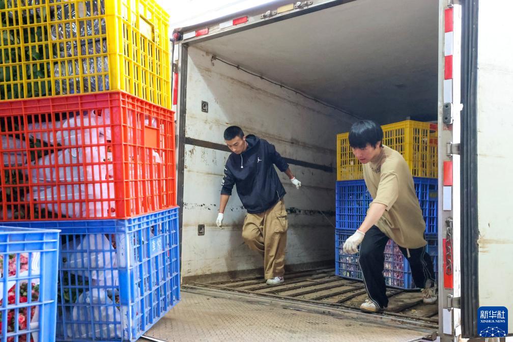 在昆明國際花卉拍賣(mài)交易中心,兩名工作人員在運輸鮮花(7月13日攝)。新華社記者 崔文 攝