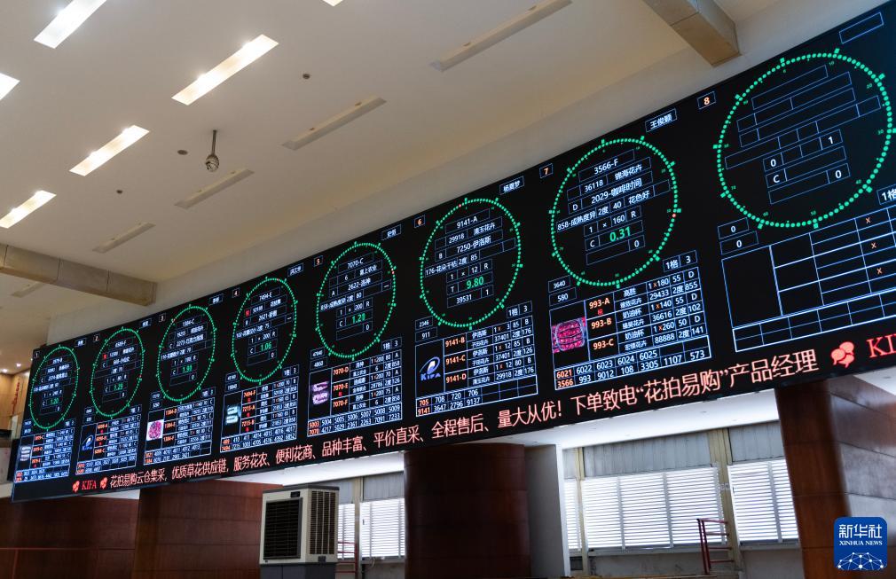 這是昆明國際花卉拍賣(mài)交易中心拍賣(mài)大廳的大屏上實(shí)時(shí)顯示的鮮花信息(7月13日攝)。新華社記者 陳欣波 攝