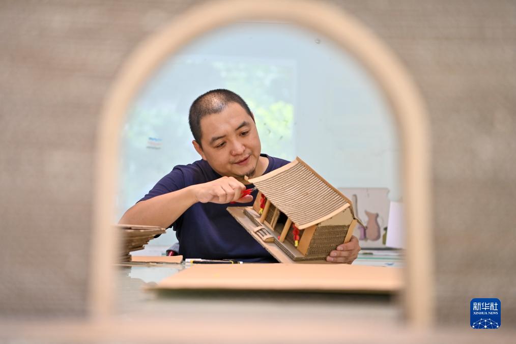 王帥棟在位于山西省太原市萬(wàn)柏林區的工作室內修整瓦楞紙作品(8月1日攝)。