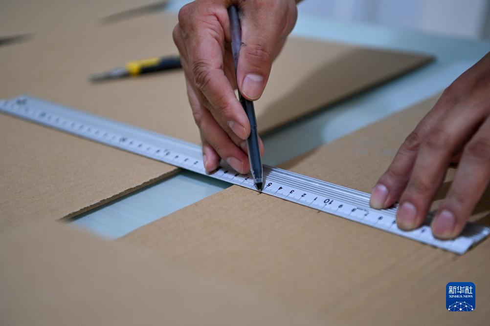 王帥棟在位于山西省太原市萬(wàn)柏林區的工作室內測量瓦楞紙尺寸(8月1日攝)。