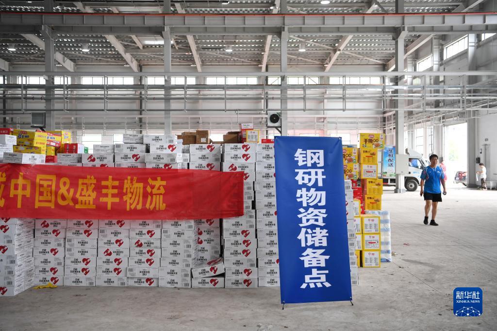 這是8月5日拍攝的河北省涿州市鋼研物資儲備點(diǎn)內存放的捐贈物資。