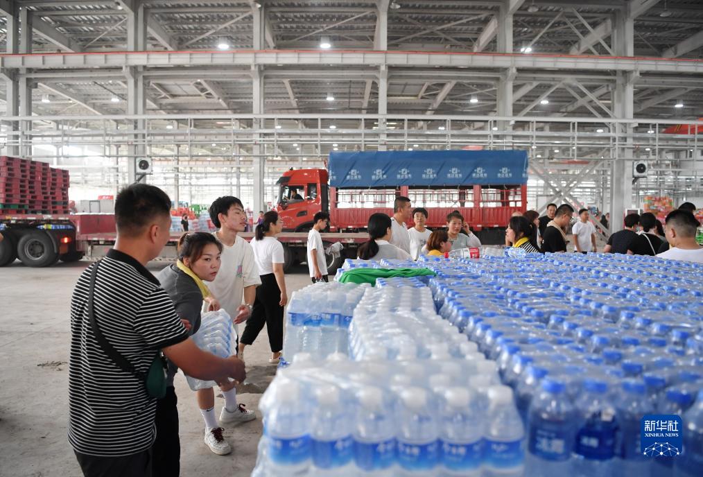 8月5日,工作人員和志愿者在河北省涿州市鋼研物資儲備點(diǎn)內搬運捐贈物資。