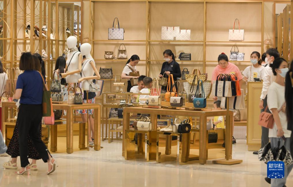 8月5日,游客在中免集團??谌赵聫V場(chǎng)免稅店選購商品。