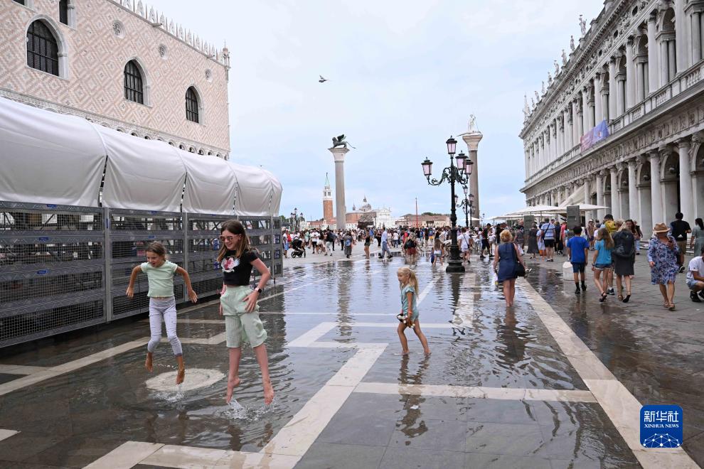 8月4日,在意大利威尼斯,幾名兒童在積水中玩耍。