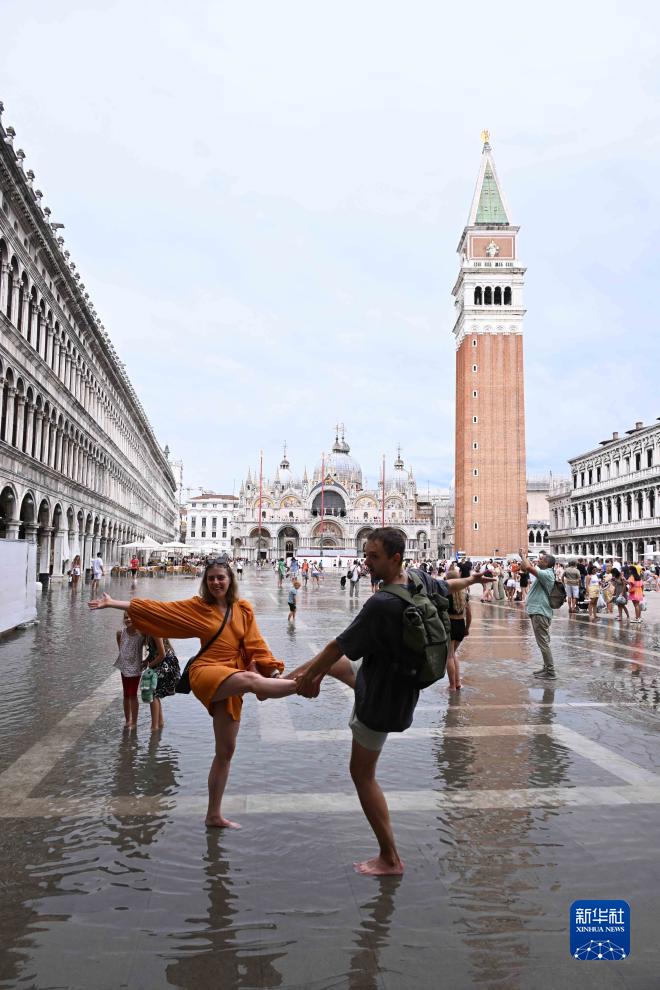 8月4日,游客聚集在意大利威尼斯積水的圣馬可廣場(chǎng)。