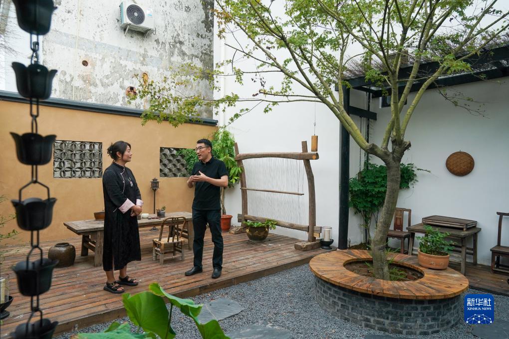在蘇州市樹(shù)山村一家民宿內,鄉村規劃師彭銳(右)和民宿主理人俞慧在聊天交流(7月14日攝)。