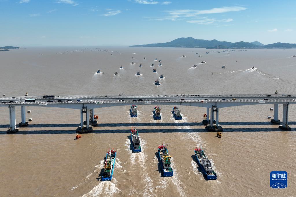 8月6日,浙江省舟山市普陀區大批漁船穿過(guò)朱家尖大橋,奔赴東海開(kāi)捕(無(wú)人機照片)。