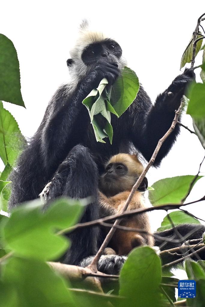 一只白頭葉猴帶著(zhù)幼猴覓食(8月4日攝)。