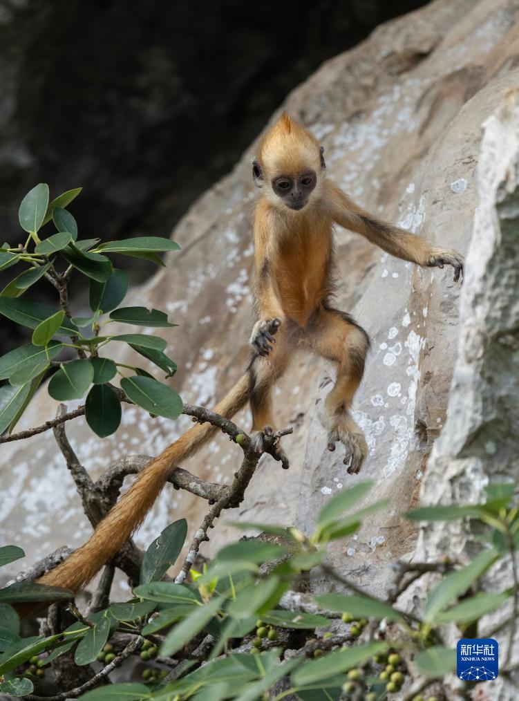 白頭葉猴,頭頂高聳著(zhù)一撮白毛,是我國特有的國家一級重點(diǎn)保護野生動(dòng)物,種群數量稀少,主要分布在廣西崇左市左江和明江之間約200平方公里的喀斯特石山地區。白頭葉猴還有個(gè)好聽(tīng)的名字——“石山精靈”。