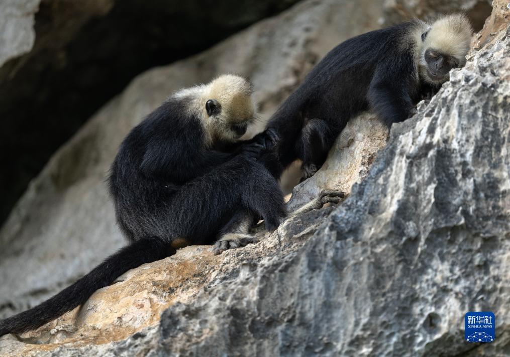 兩只白頭葉猴在巖壁上休憩(8月5日攝)。
