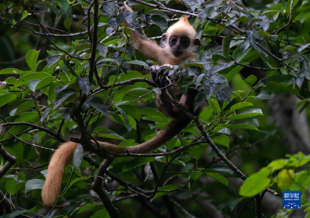 一只白頭葉猴幼猴在樹(shù)上張望(8月5日攝)。