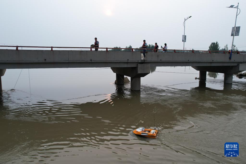 海委水文局水文應急監測小分隊在大清河上測流作業(yè)(8月4日攝,無(wú)人機照片)。