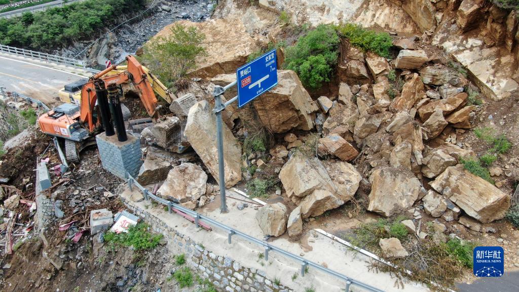 8月6日,在北京市房山區史家營(yíng)鄉金雞臺村附近,北京建工機施集團的大型機械設備在清理阻斷道路的落石(無(wú)人機照片)。