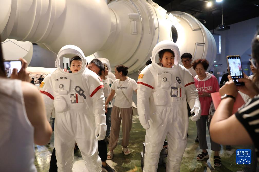 8月6日,小朋友們在位于沈陽(yáng)市的遼寧省科技館里航天展區參觀(guān)留影。